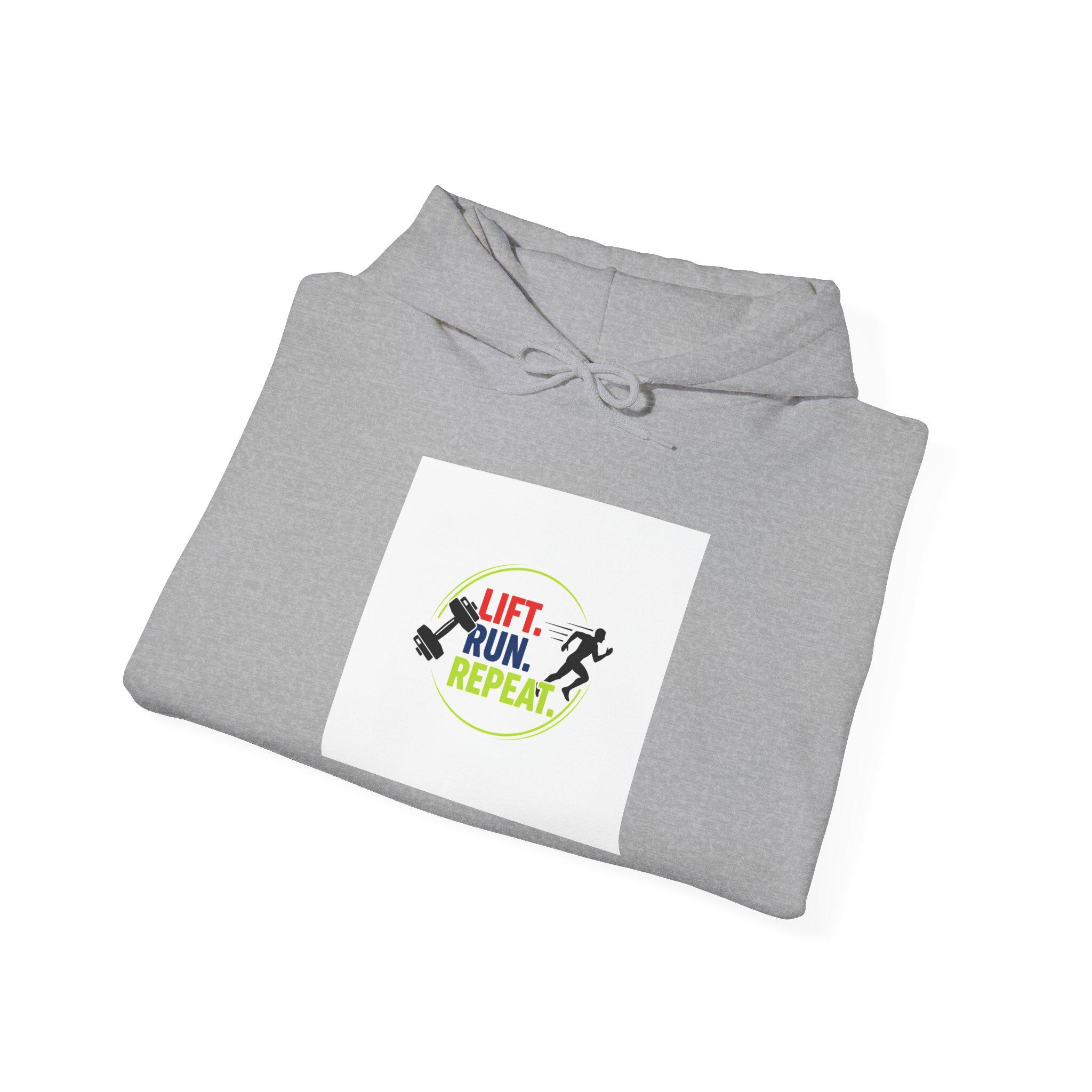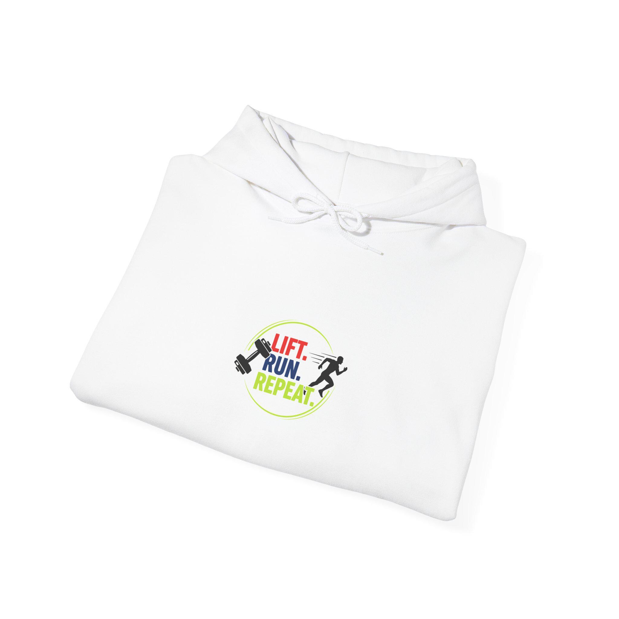Minimal, gym-driven chest graphic that reads as a short training mantra — bold stacked text with small runner and lifter icons and a semicircle energy burst. Clean, high-contrast colors on a crisp white hooded sweatshirt give an energetic, studio-to-street look that reads like active-wear motivation. The compact placement keeps the statement subtle while reinforcing a disciplined, movement-focused aesthetic popular with fitness and active lifestyle shoppers.