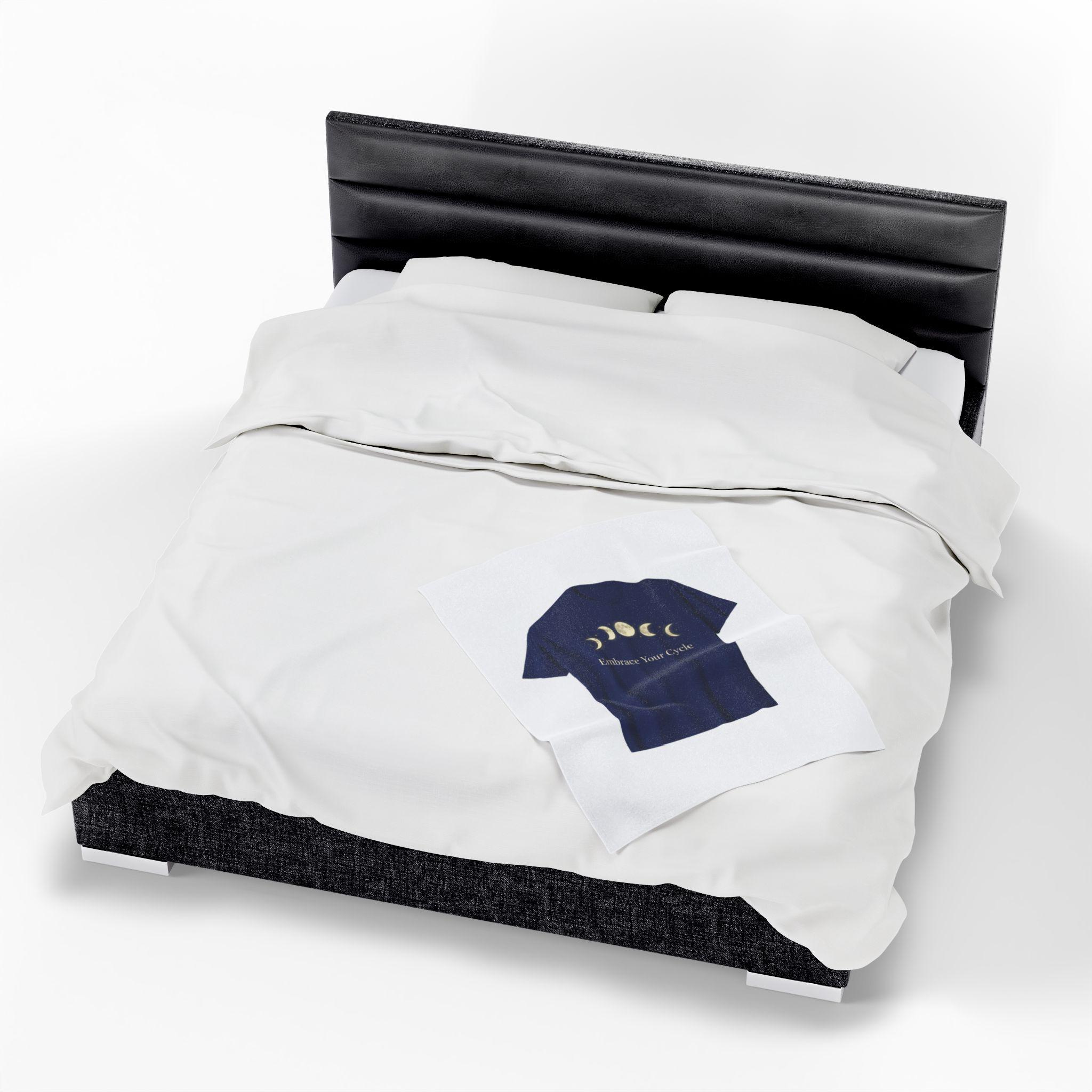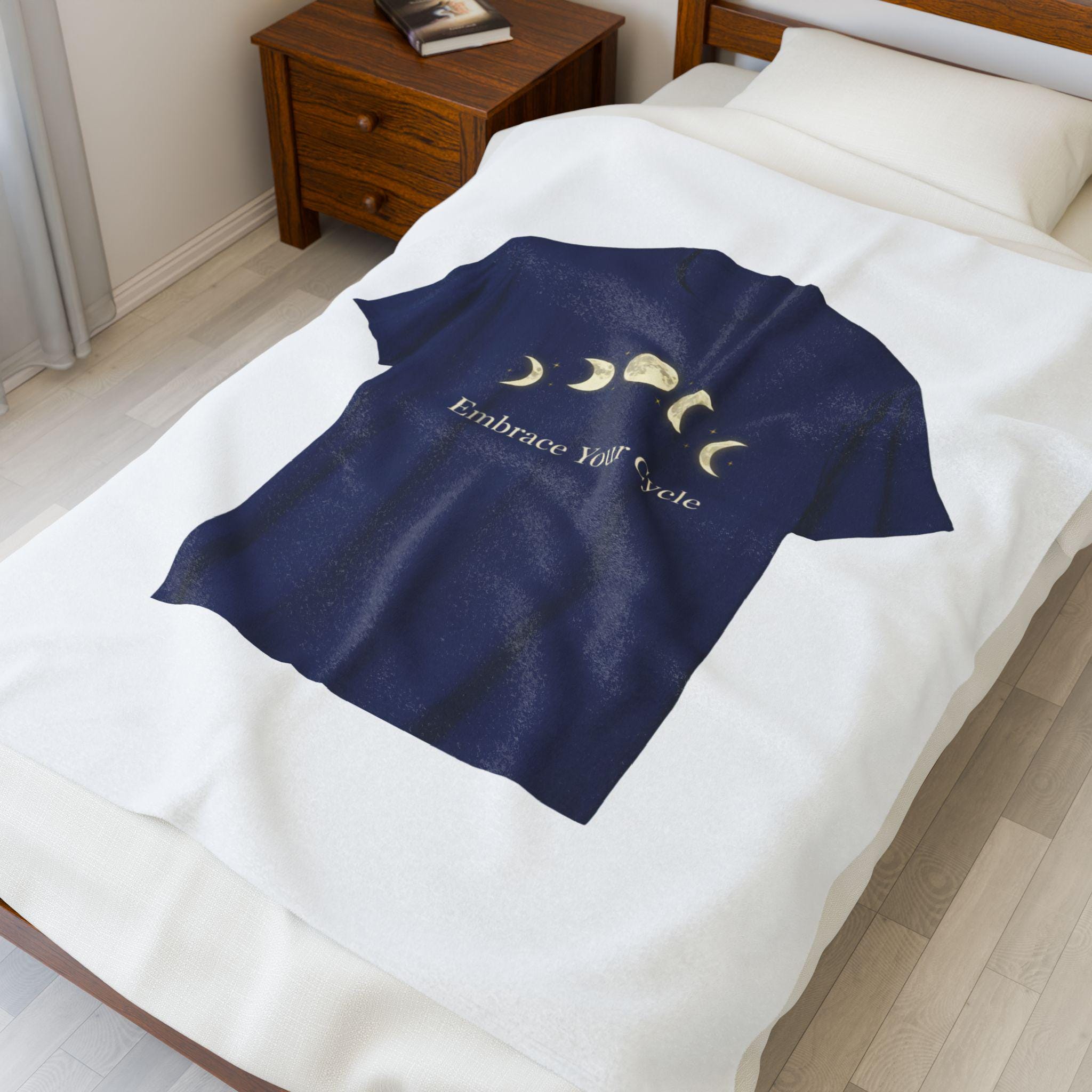 Midnight-inspired velveteen blanket printed with a calm lunar sequence and a gentle self-care prompt. The design shows gold-toned moon phases arranged in an arc above a serif script affirmation, echoing celestial-wellness visuals used in lunar journals and ritual calendars. The navy and cream palette and soft texture make it a tactile layer for bedtime rituals, meditation corners, or quiet reflection sessions.