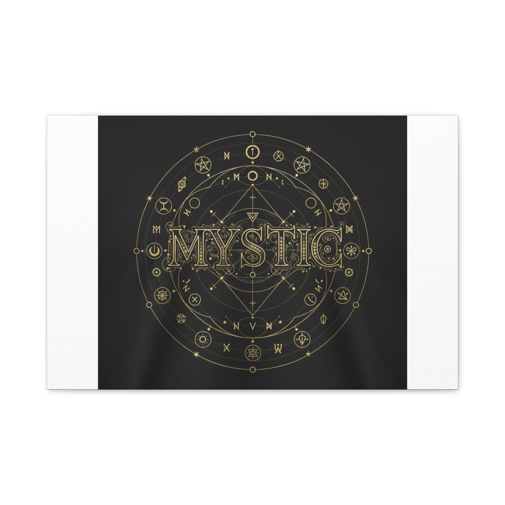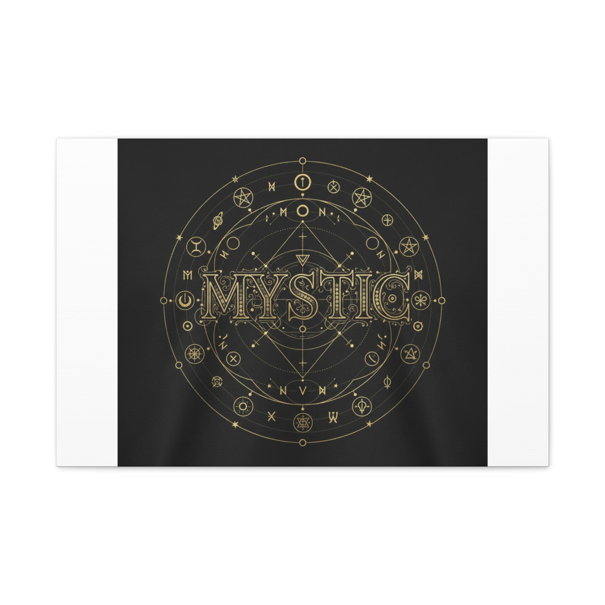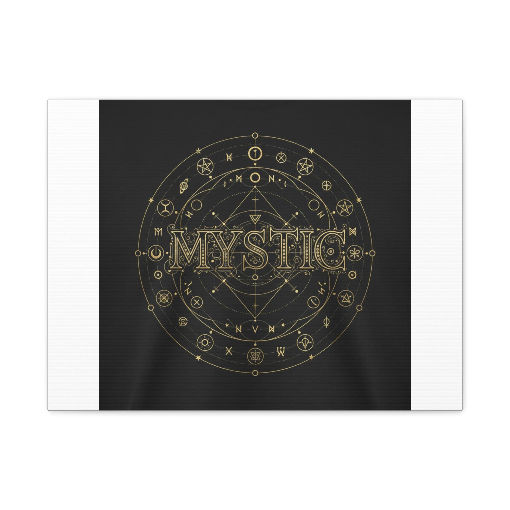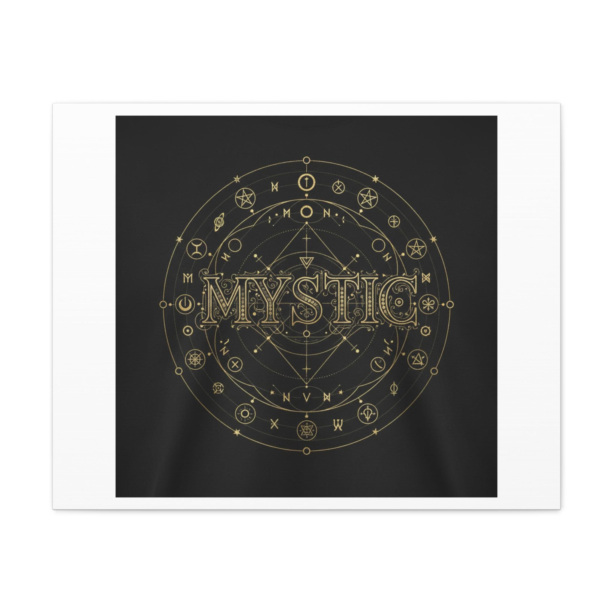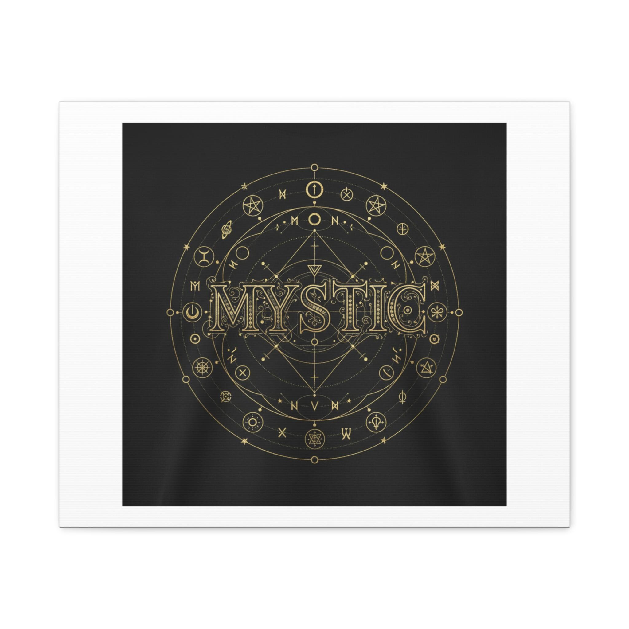 Mystic — a moody, type-led occult canvas that pairs ornate serif lettering with alchemical symbols in a gilded, circular sigil. The design places the word “MYSTIC” at the center of a structured grid of concentric rings, runes, and planetary motifs rendered in metallic gold tones against deep matte black, giving a velvety, enigmatic feel that matches the Tarot & Occult Typography trend. Printed on coated cotton-poly canvas with a subtle texture, the stretched frame and soft rubber dots make it easy to hang while preserving print clarity and archival quality. This piece suits alt and witchy interiors or reading nooks where symbolic, typographic art complements ritual or contemplative spaces.