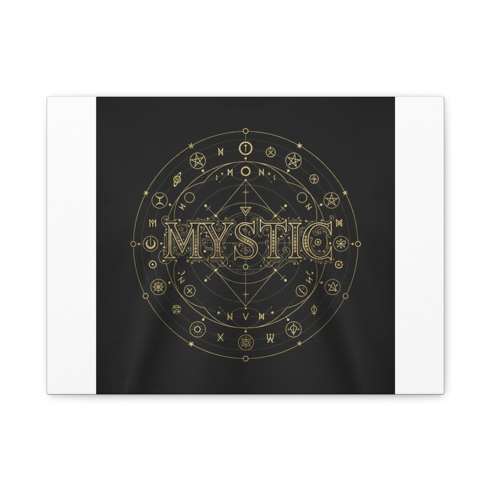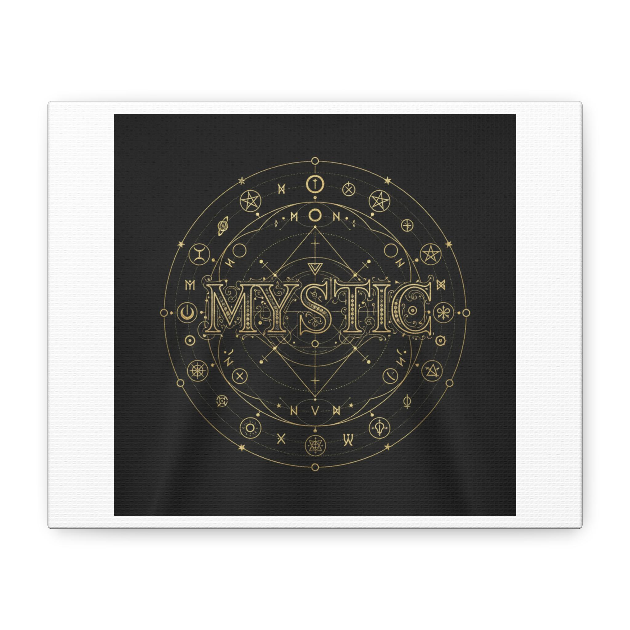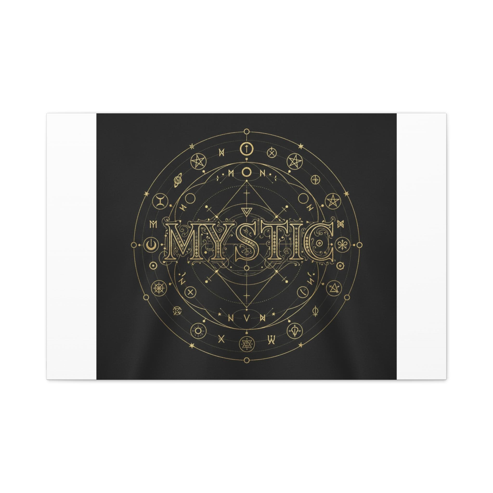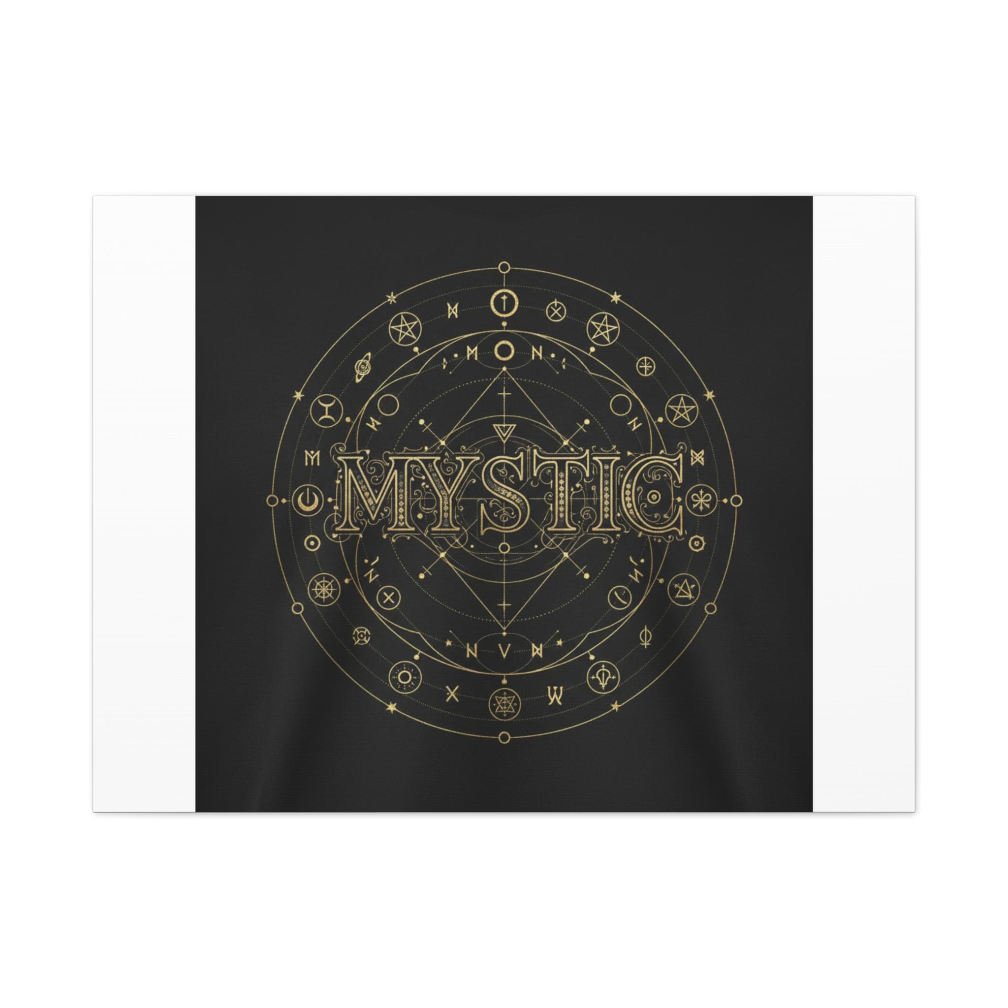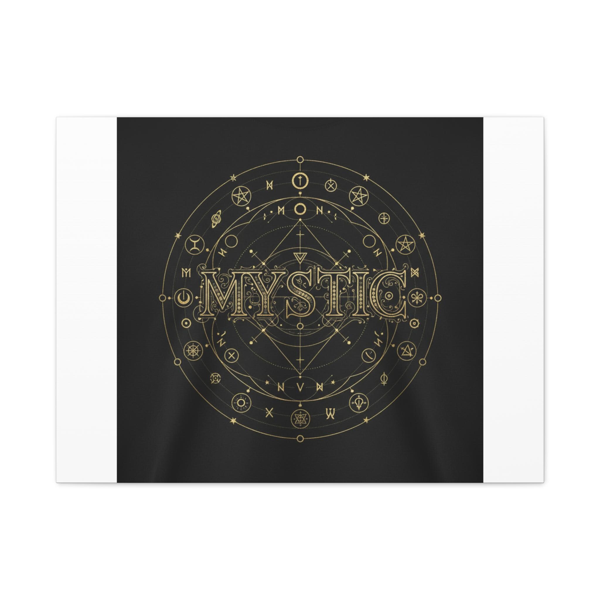 Mystic — a moody, type-led occult canvas that pairs ornate serif lettering with alchemical symbols in a gilded, circular sigil. The design places the word “MYSTIC” at the center of a structured grid of concentric rings, runes, and planetary motifs rendered in metallic gold tones against deep matte black, giving a velvety, enigmatic feel that matches the Tarot & Occult Typography trend. Printed on coated cotton-poly canvas with a subtle texture, the stretched frame and soft rubber dots make it easy to hang while preserving print clarity and archival quality. This piece suits alt and witchy interiors or reading nooks where symbolic, typographic art complements ritual or contemplative spaces.