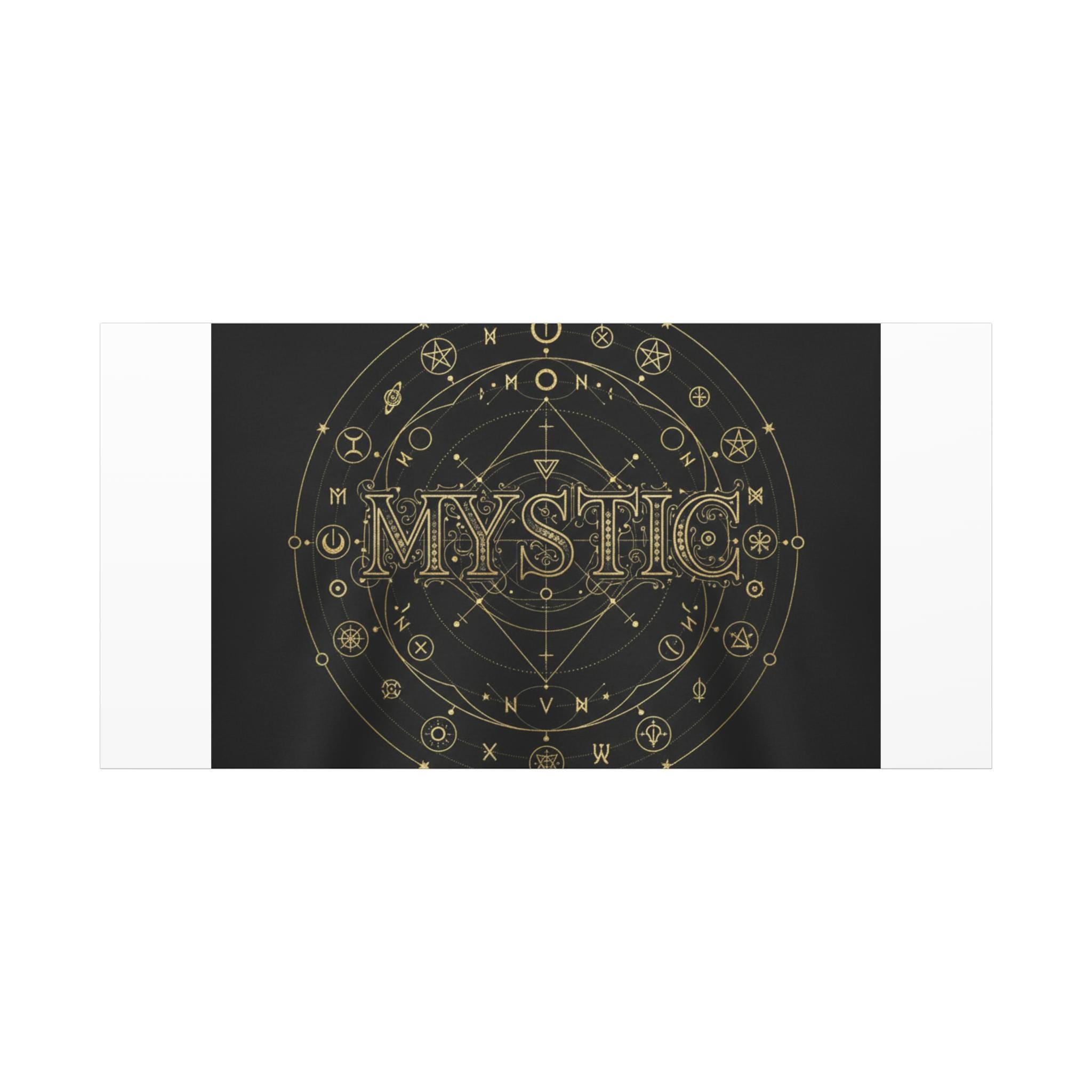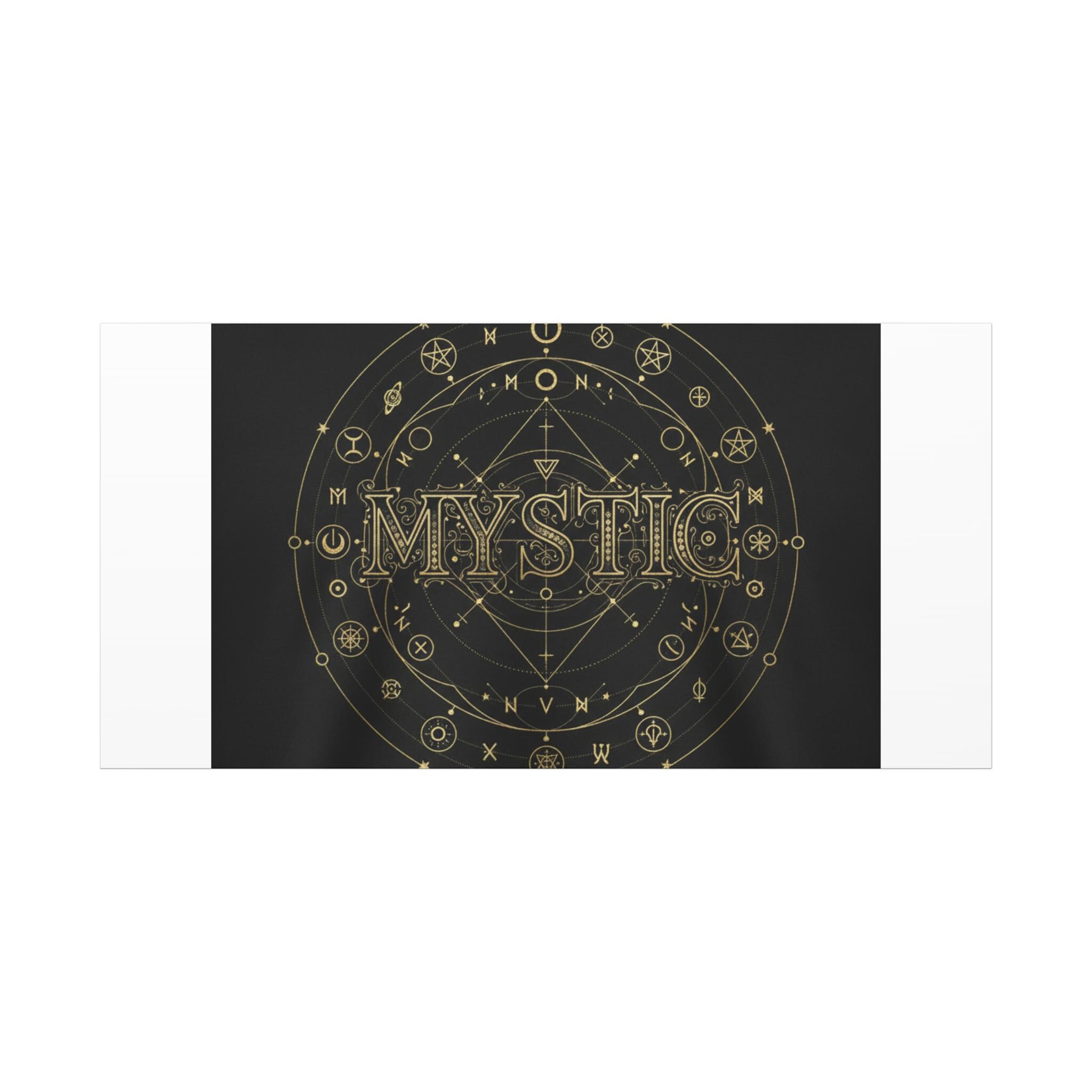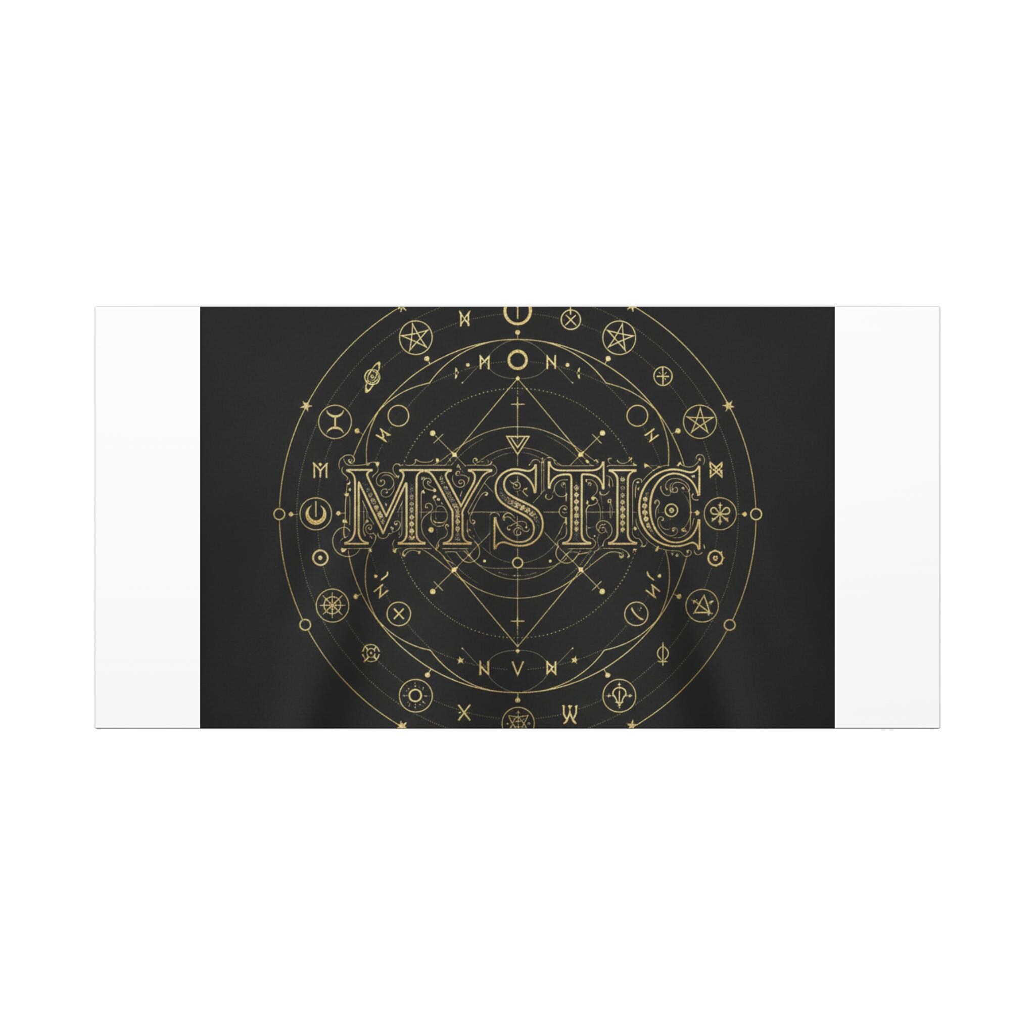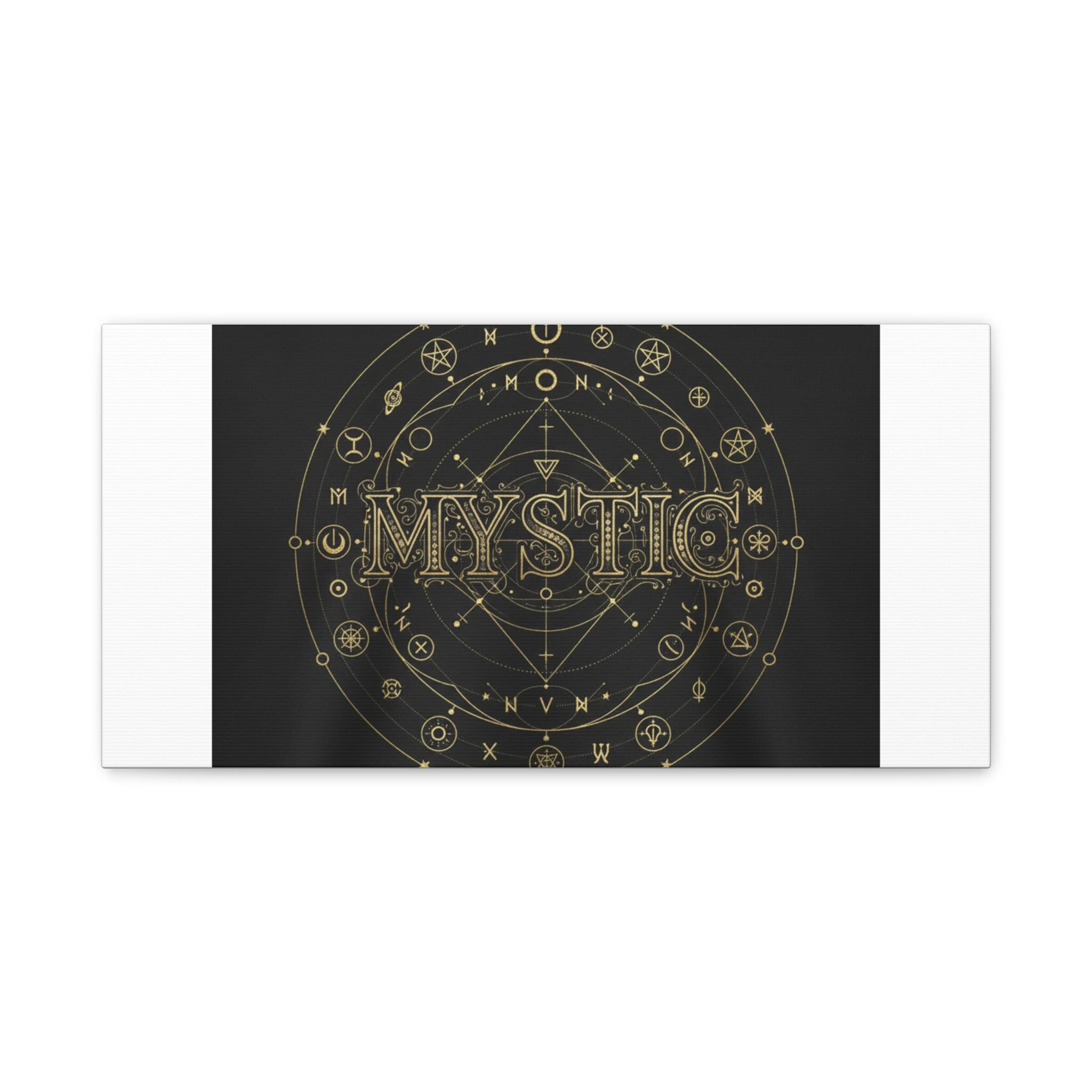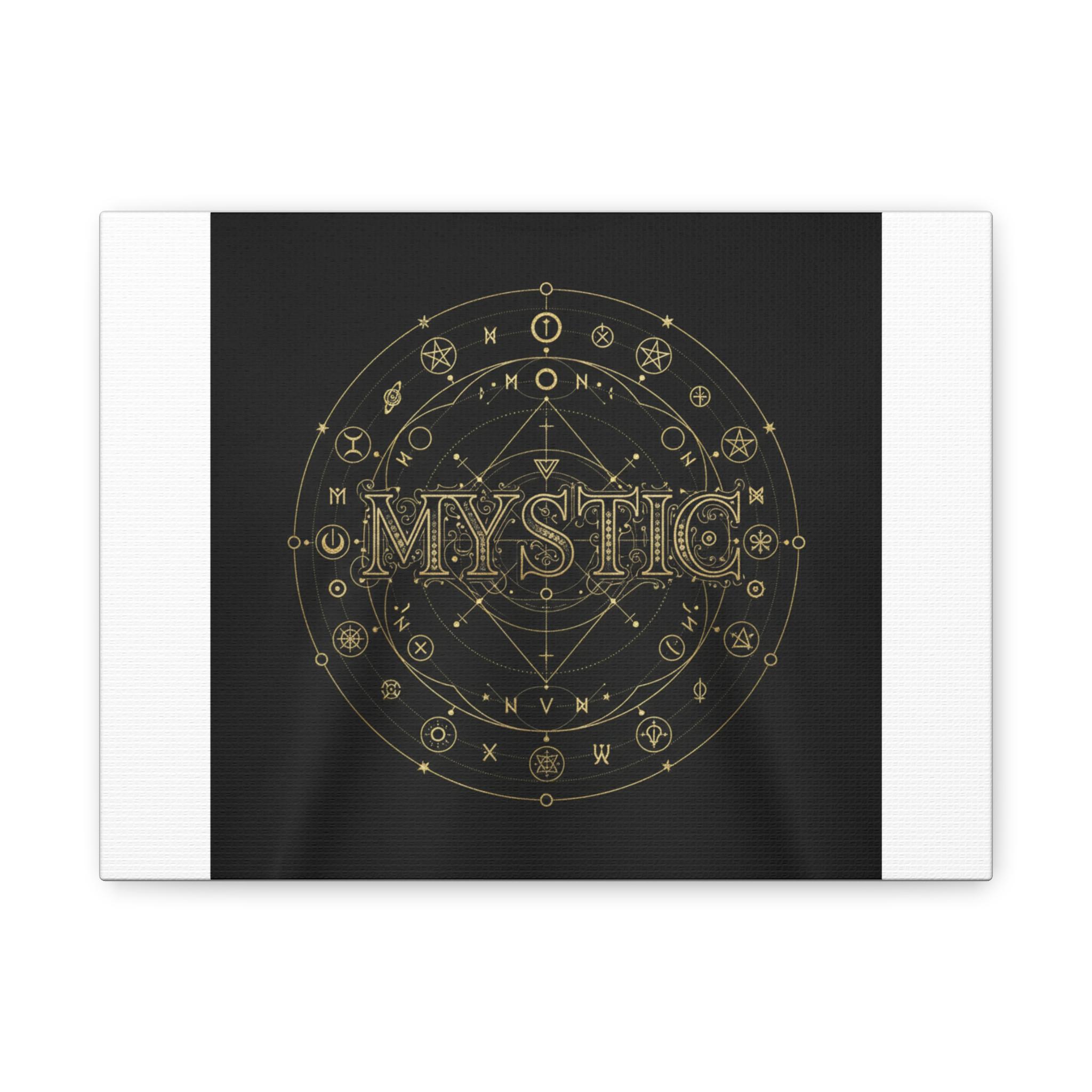 Mystic — a moody, type-led occult canvas that pairs ornate serif lettering with alchemical symbols in a gilded, circular sigil. The design places the word “MYSTIC” at the center of a structured grid of concentric rings, runes, and planetary motifs rendered in metallic gold tones against deep matte black, giving a velvety, enigmatic feel that matches the Tarot & Occult Typography trend. Printed on coated cotton-poly canvas with a subtle texture, the stretched frame and soft rubber dots make it easy to hang while preserving print clarity and archival quality. This piece suits alt and witchy interiors or reading nooks where symbolic, typographic art complements ritual or contemplative spaces.