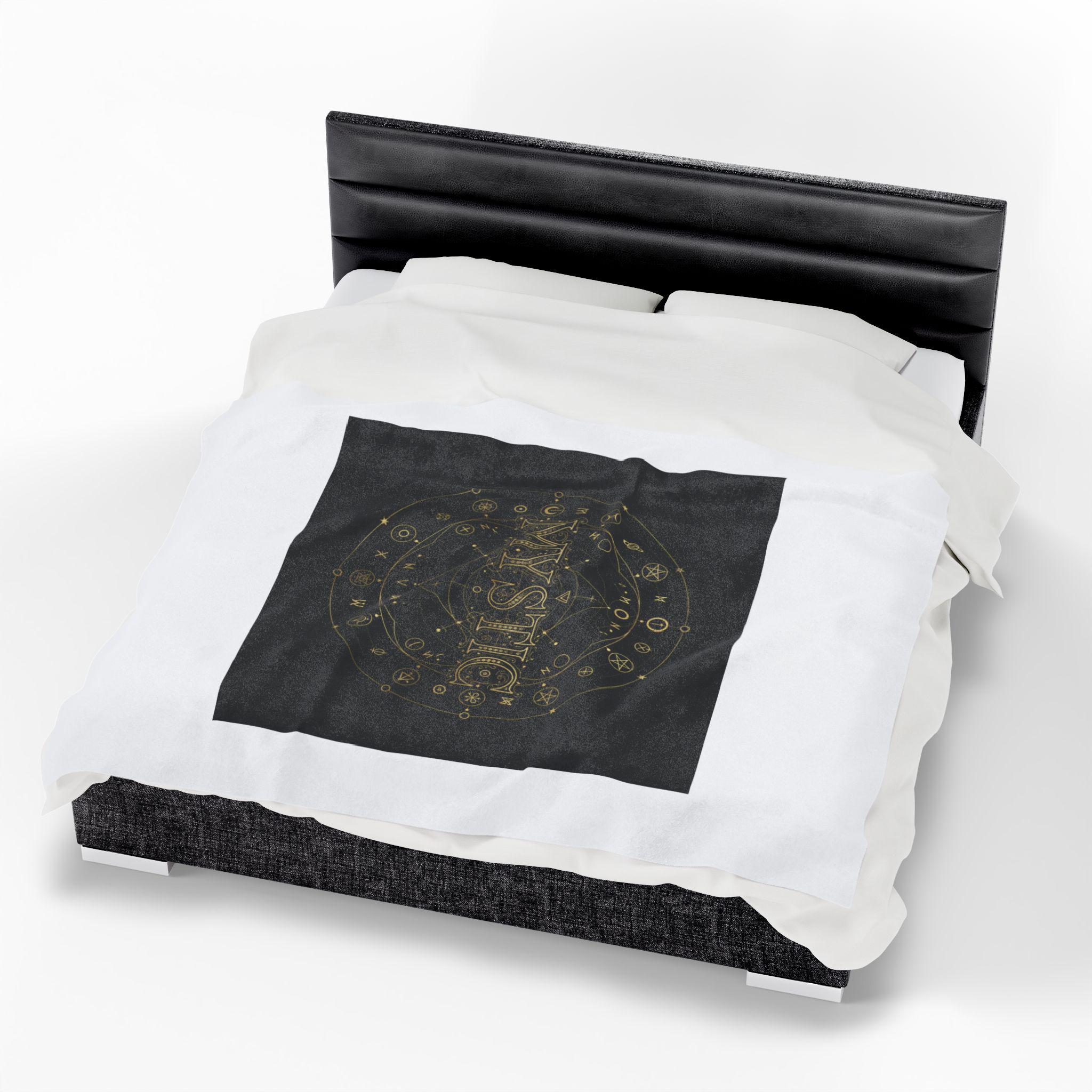 Velvet-like plush blanket printed with a dark, type-led occult emblem: a centered circular sigil rendered in metallic-gold tones with ornate serif lettering spelling a single archetypal word. The design reads as moody, arcane decor—a tactile layer that brings tarot and occult typography vibes to a reading nook, altar shelf, or cozy evening ritual. Its structured, typographic sigil and alchemical motifs map directly to the tarot & occult typography trend, offering subtle mystic symbolism without referencing specific decks or characters.